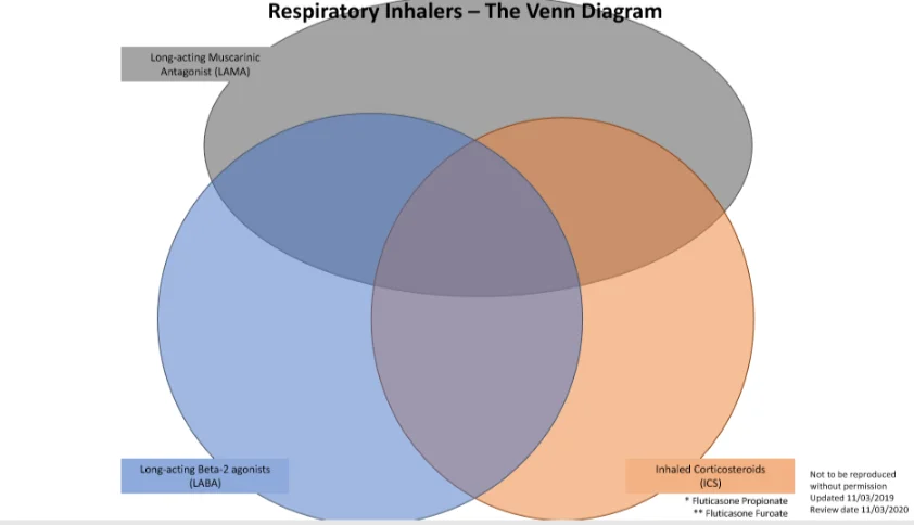 UKIG have designed a Venn diagram explaining which inhalers are licensed for COPD and which are licensed for Asthma. You can get a free copy of the PDF document by getting in touch.